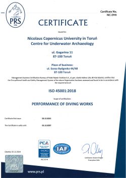 Centrum Archeologii Podwodnej UMK w Toruniu jest jedynym ośrodkiem naukowym w Polsce, posiadającym Certyfikat Bezpieczeństwa BHP w zakresie prowadzenia prac podwodnych w normie ISO: 45001:2018.